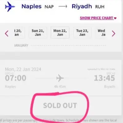 Wizz Air, garantisce ancora voli speciali da Napoli, Roma e Milano a Riyadh per assistere alla finale di Supercoppa italiana che si svolgerà proprio nella capitale saudita il 22 gennaio. E' necessario seguire la procedura corretta per evitare l'errore che si vede nella foto copertina di questo articolo.