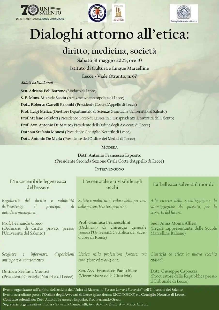 Si terrà sabato 31 maggio 2025 alle ore 10, presso l'Istituto Marcelline di Lecce, il convegno dal titolo “Dialoghi attorno all'etica: diritto medicina e società”.